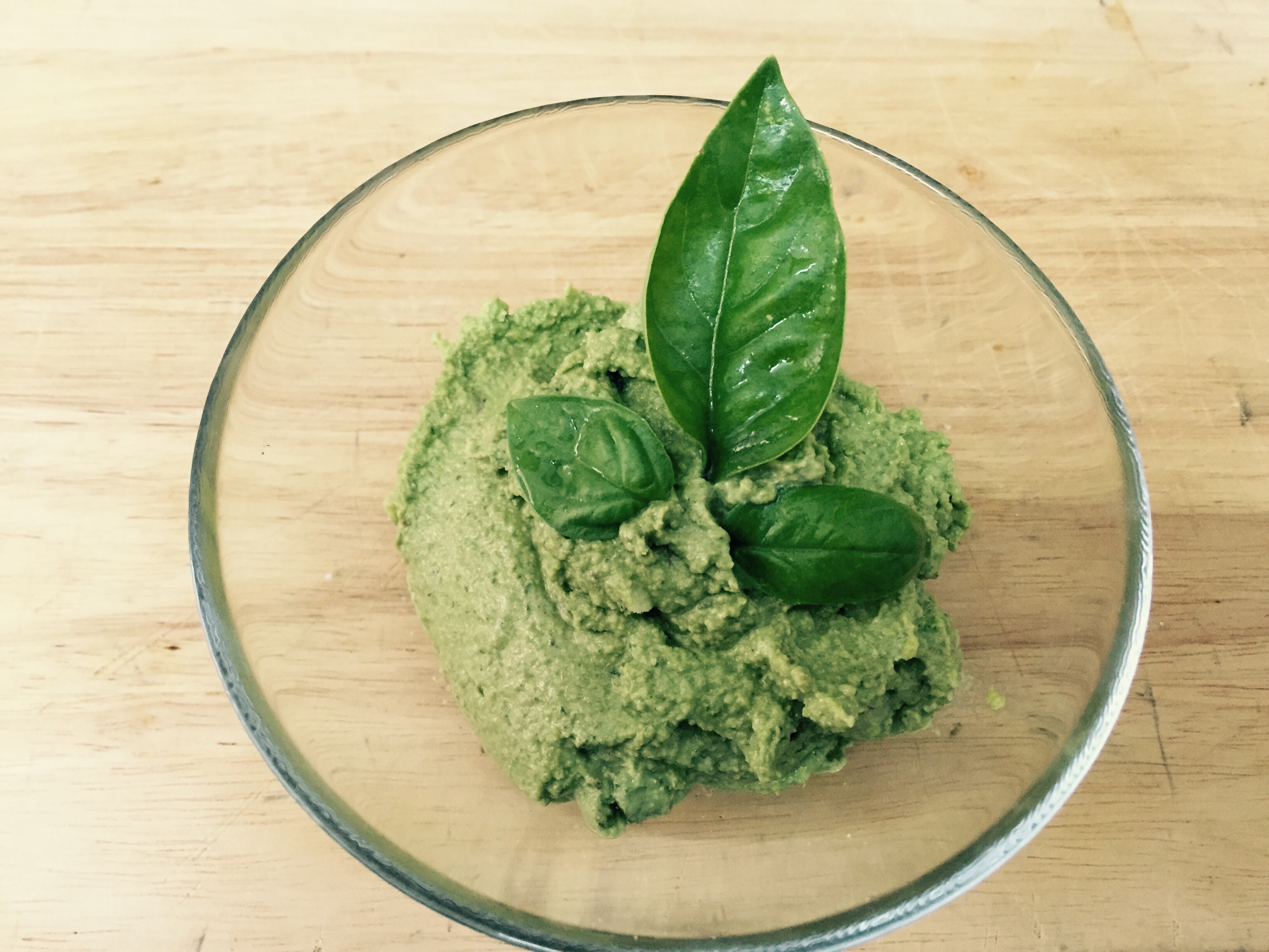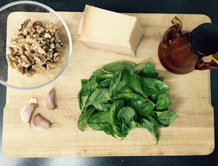 Piquei as folhas, as nozes e o alho com a varinha mágica; quando já estava em pasta adicionei o fio de azeite e o queijo.