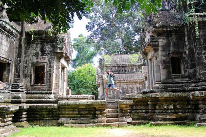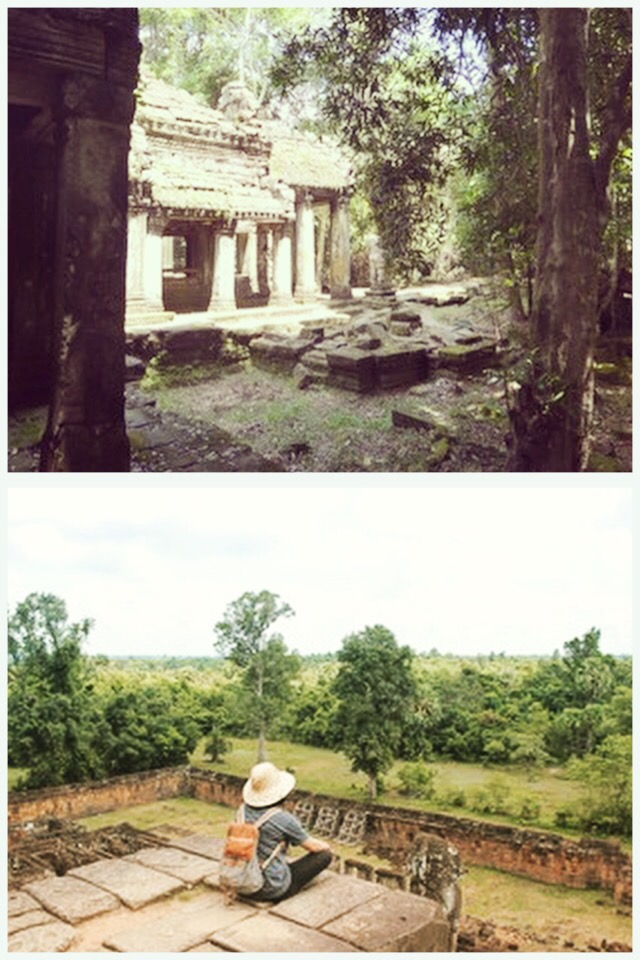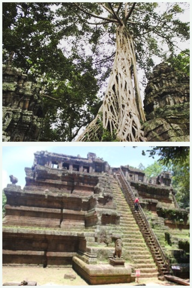 Nós entravamos, subíamos, descíamos, saltávamos, corríamos de cima a baixo; sacávamos fotos, descansávamos à sombra das imensas árvores; conversávamos contagiados pela energia do lugar, ou ficávamos em silêncio absorvidos pela chocante paisagem. Às vezes falávamos com outros visitantes, falávamos com os cambojanos que encontrávamos no caminho; meditávamos, abraçávamo-nos e deixávamo-nos encantar pela magia que nos rodeava. Podia passar horas no meio daquelas pedras todas a olhar para as árvores sem fim. Ou ficar no meio dos troncos, que os meus braços não chegavam para abraçar, a olhar fascinada para as imagens esculpidas no amontoado de pedras à nossa volta.