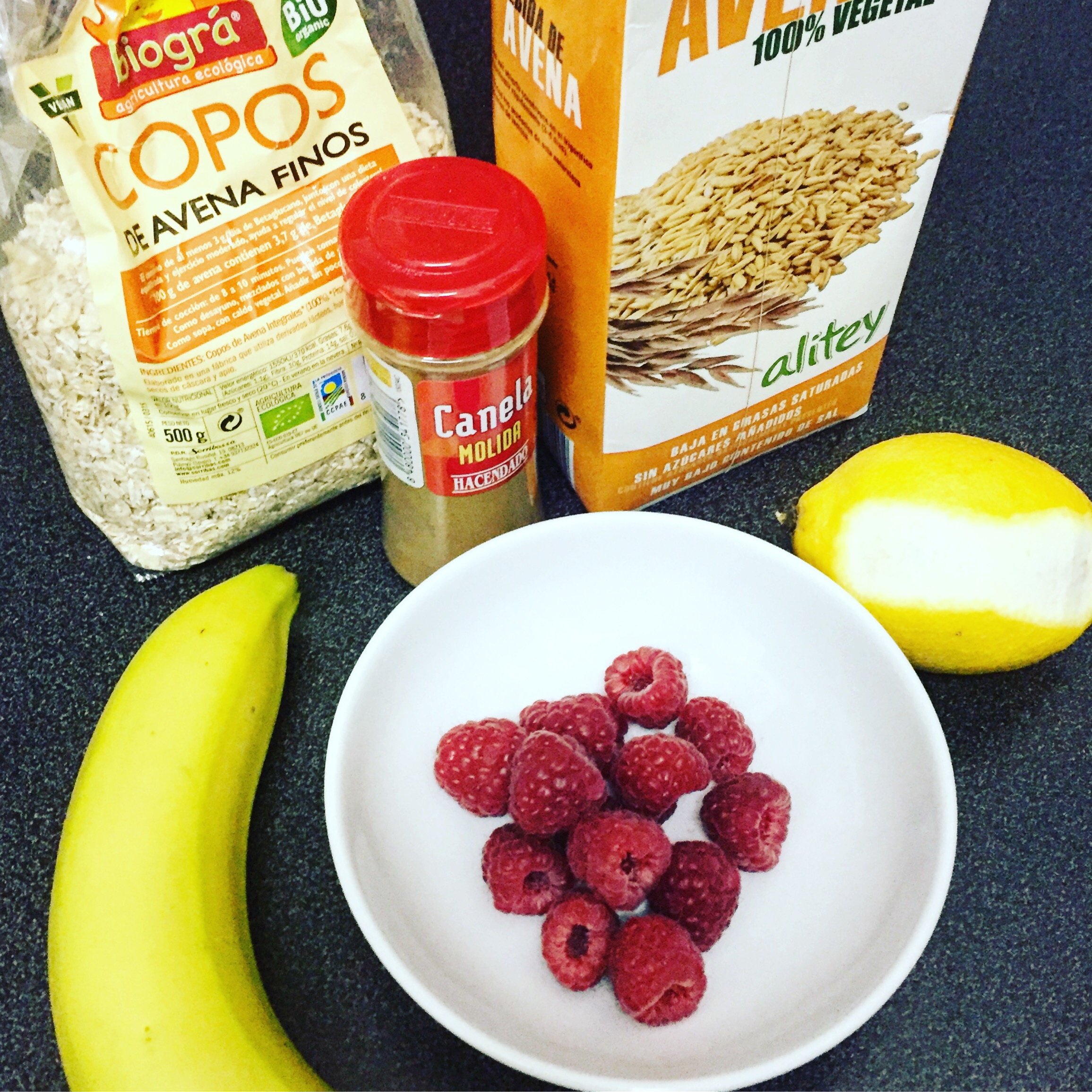 Levar o leite ao lume com a casca de limão e quando estiver morno acrescentar os flocos de aveia.Deixar cozer entre 3 a 5 minutos, nunca parando de mexer. Retirar do lume quando a consistência estiver do vosso agrado, deixar arrefecer um bocadinho, polvilhar com canela e pôr um fio de mel. Servir com as rodelas de banana e as frambuesas.