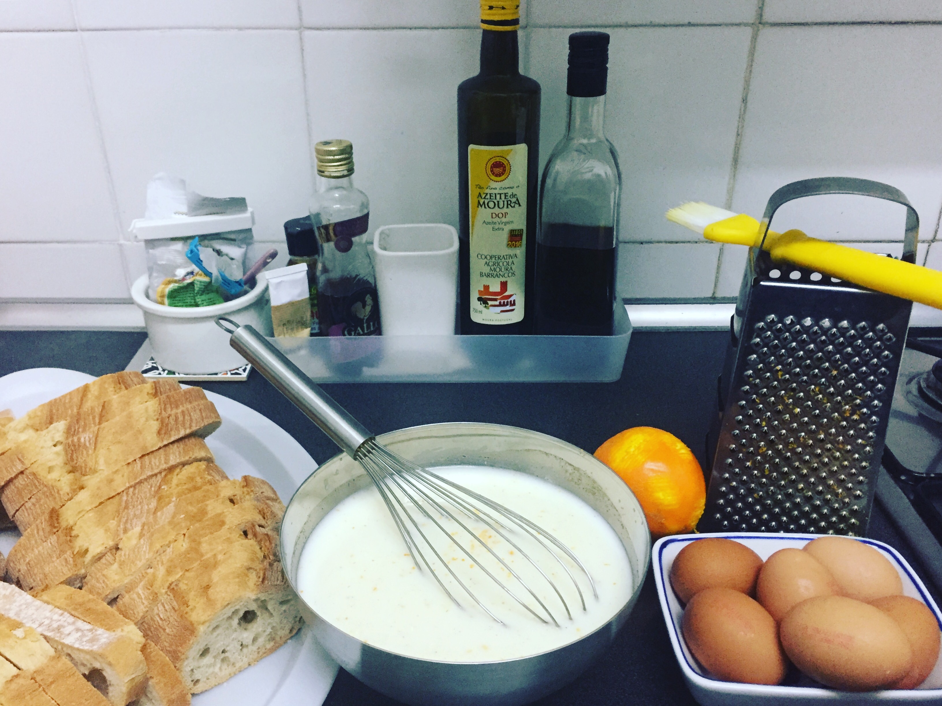 Preparação: Corta-se o pão às fatias, e em dois recipientes, põe-se separadamente, os ovos batidos e o leite morno. Aromatiza-se o leite com a raspa de uma laranja e mistura-se com as 6 colheres de açucar e uma pitada de canela em pó. Passam-se as fatias de pão primeiro pelo leite e depois pelos ovos e espalham-se no tabuleiro forrado com papel vegetal, previamente untado com bastante manteiga. Vai ao forno a 200graus durante 15 minutos, viram-se as fatias e ficam mais 10 minutos no forno. Retiram-se e polvilham-se com açucar e canela!