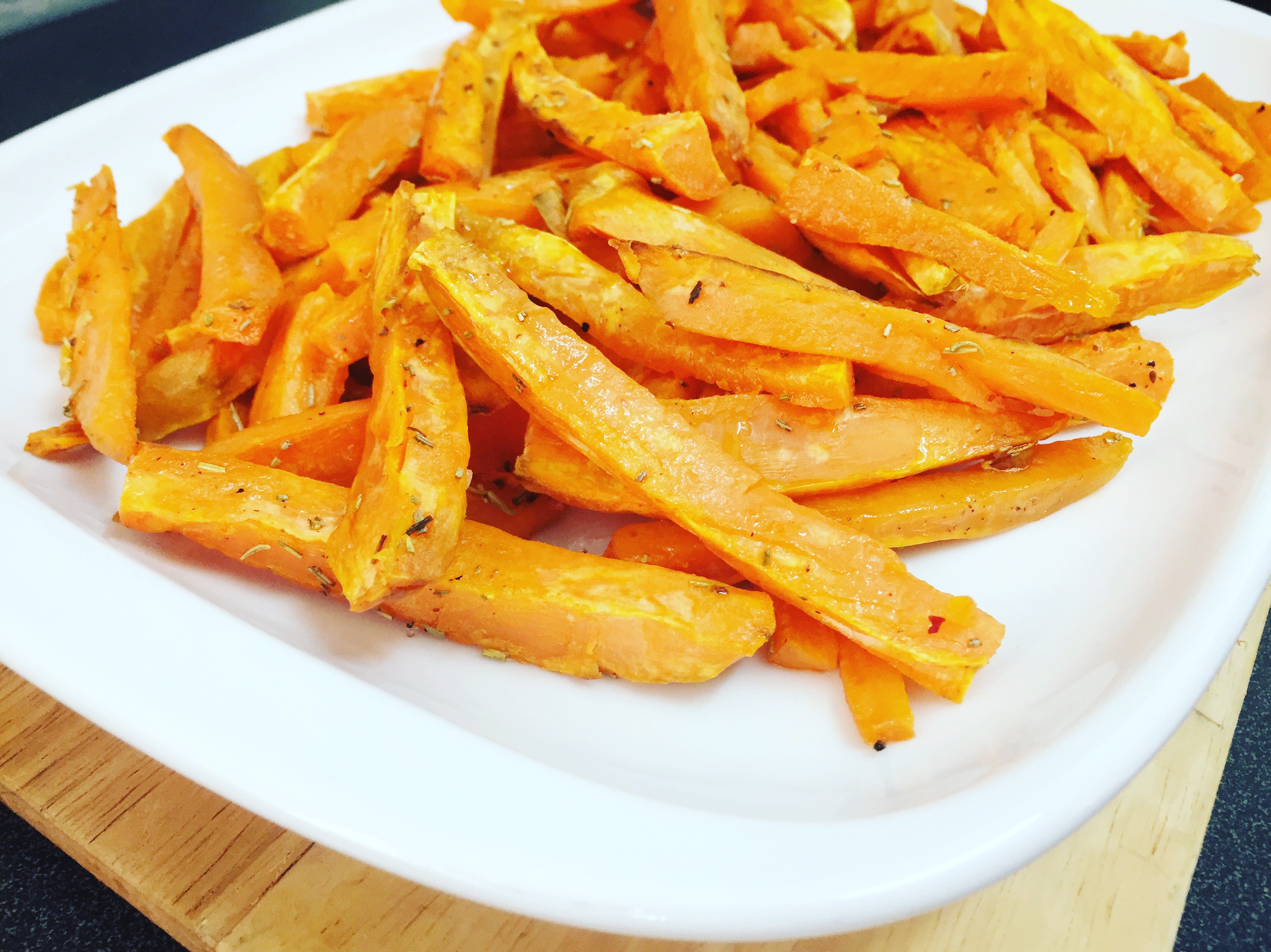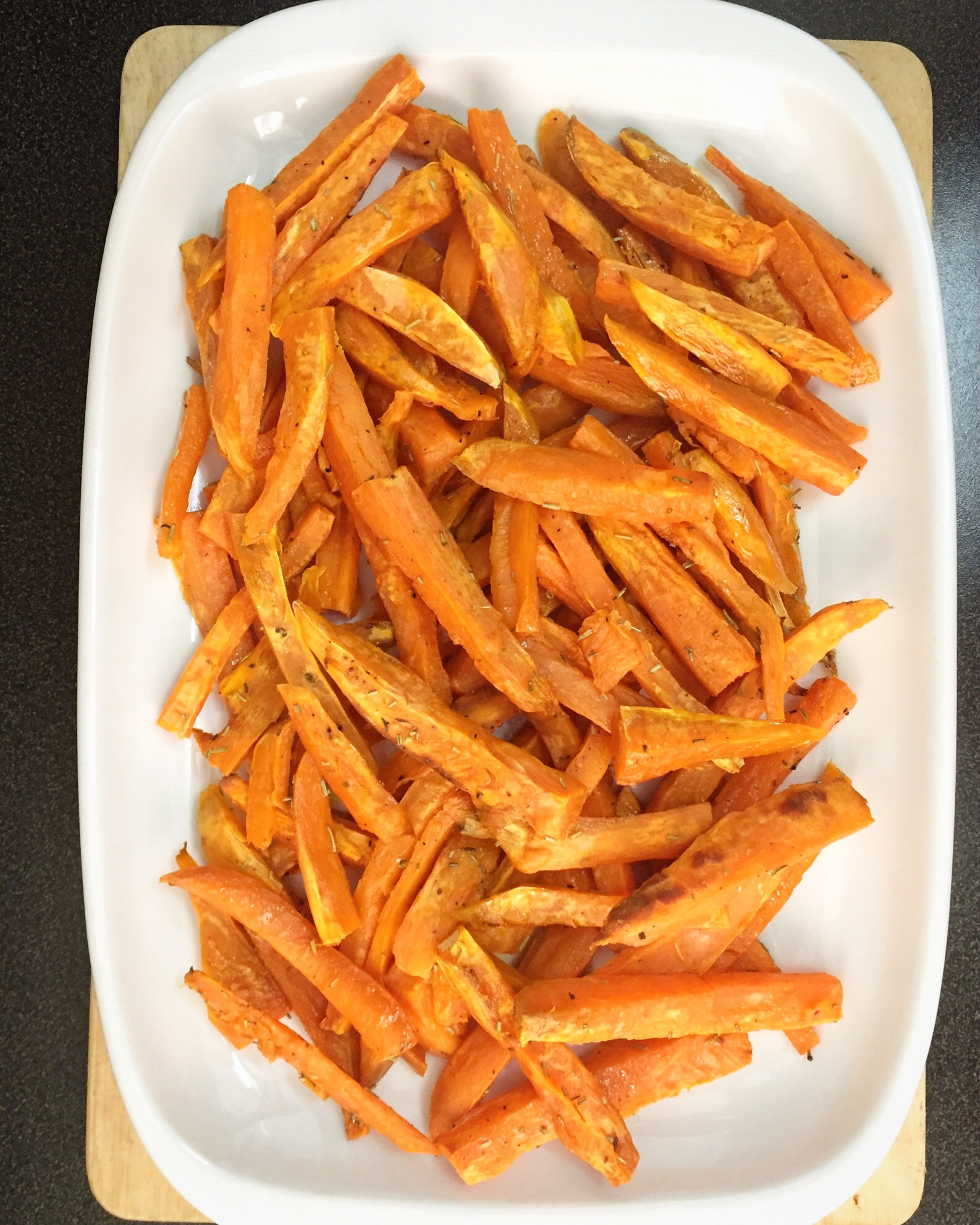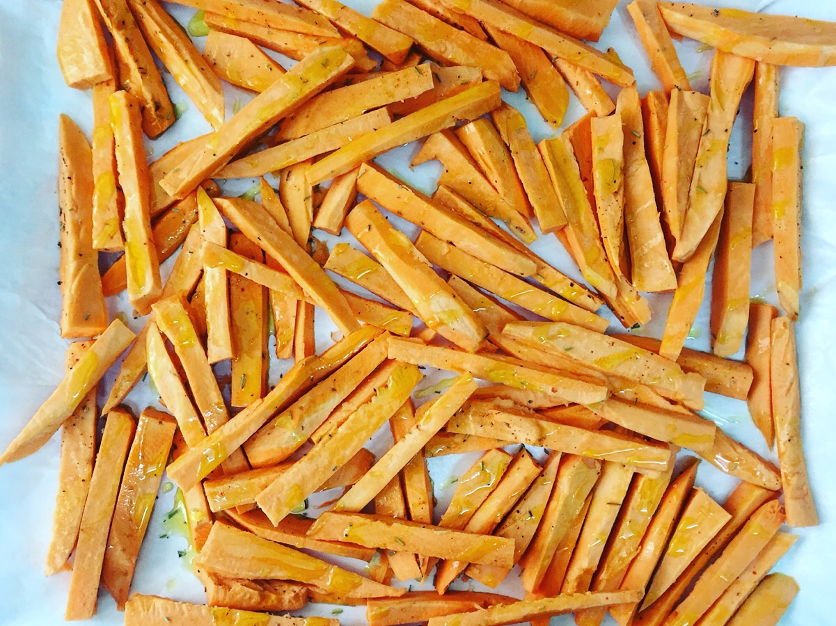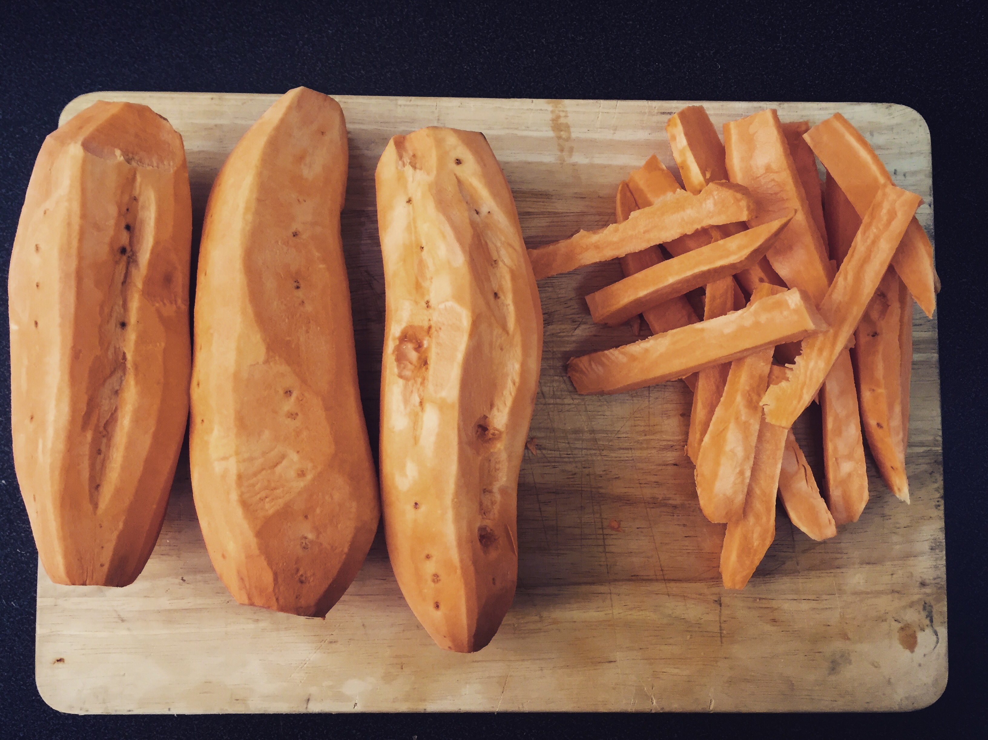 Descascam-se os boniatos, lavam-se e cortam-se aos palitos.