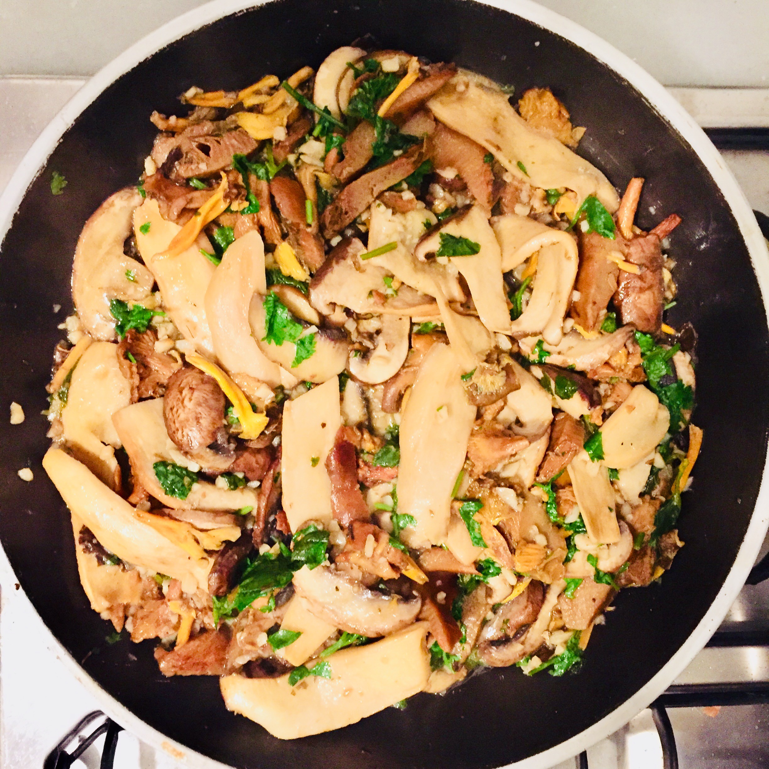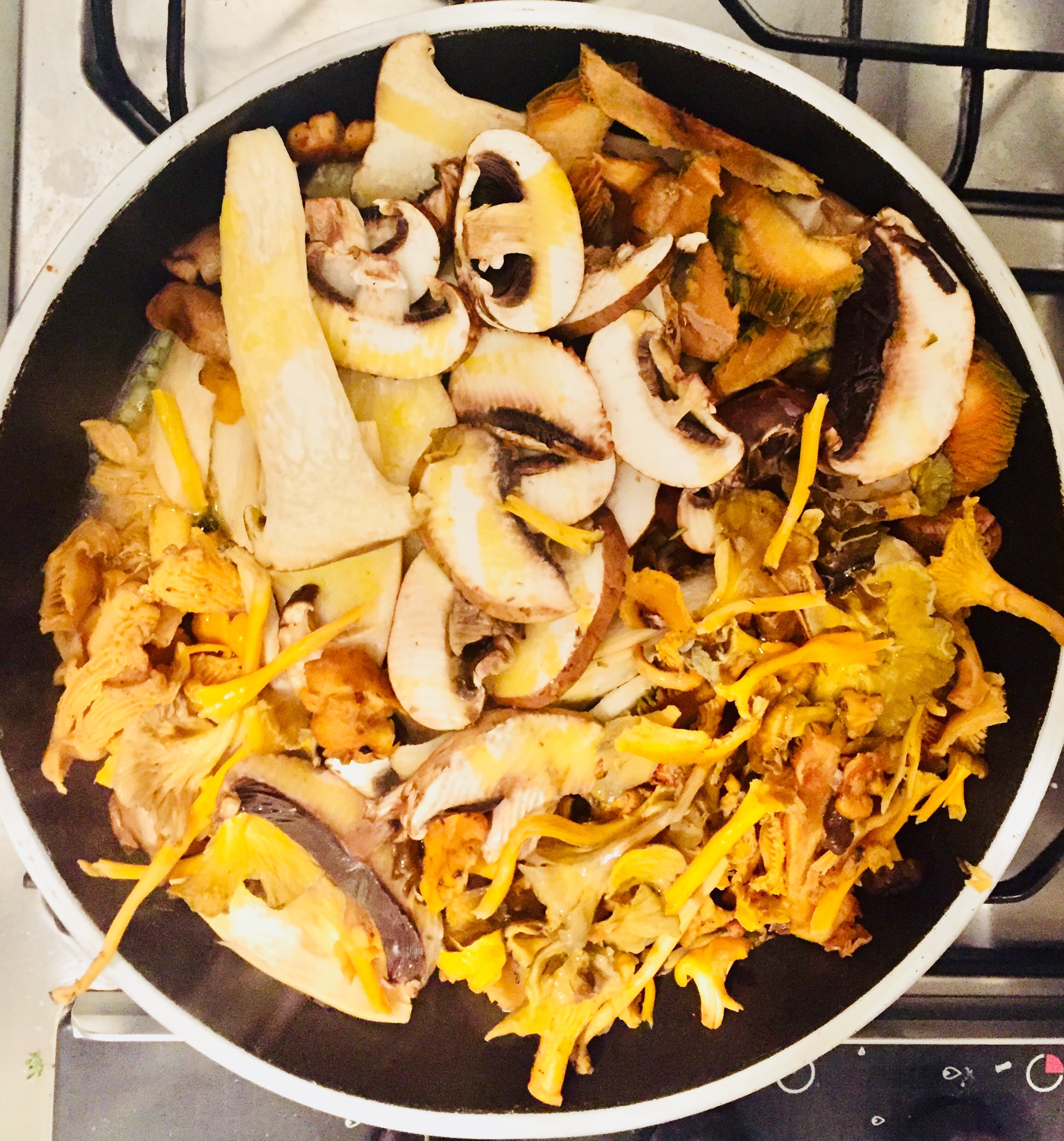 Numa frigideira com alho picadinho e um fio generoso de azeite, salteámos os diferentes cogumelos; deixámos que começassem a libertar toda a agua (e libertaram bastante), juntámos uma pitada de sal, cominhos, pimenta e com o lume alto juntámos um cálice de vinho branco.