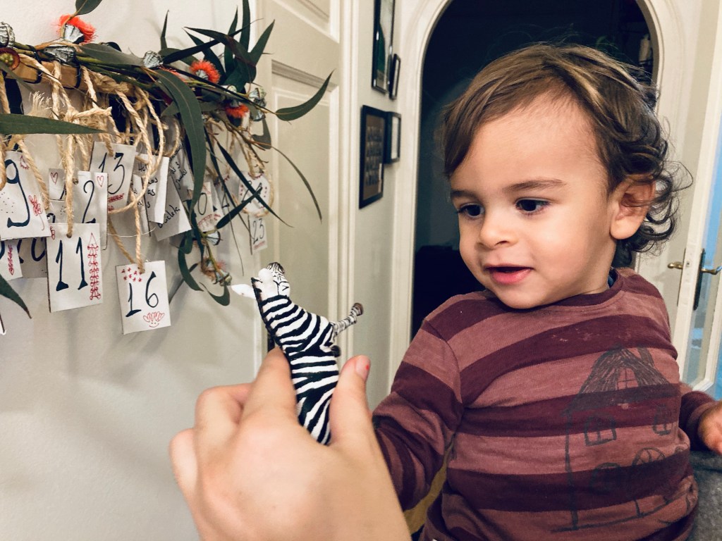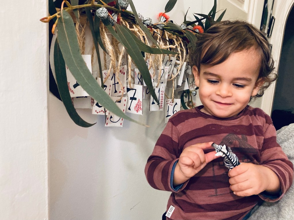 A ideia é que todos os dias quando chegue da creche, ele vá ao calendário do advento ver qual a proposta do dia. Assim como o ensinámos a tirar o casaco e os sapatos e a pôr num determinado sítio, adaptado à sua estatura, sempre que chega a casa. Também agora, virar o papelinho do calendário e descobrir o que faremos de especial nesse dia, fará parte da sua rotina durante o mês de Dezembro.