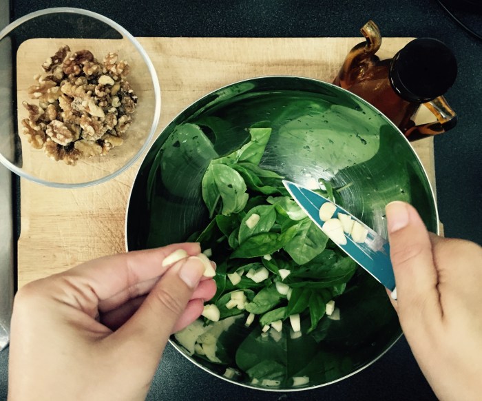 Este domingo fizemos um molho de pesto, com as folhas de manjericão cá da horta e a verdade é que ficou delicioso. Aqui vai a receita, tudo a olho!! 1 punhado de folhas de manjericão 1 pedaço pequeno de queijo parmesão 1 taça com nozes 3 dentes de alho 1 fio de azeite Piquei as … Continue reading [O pesto da nossa horta]
